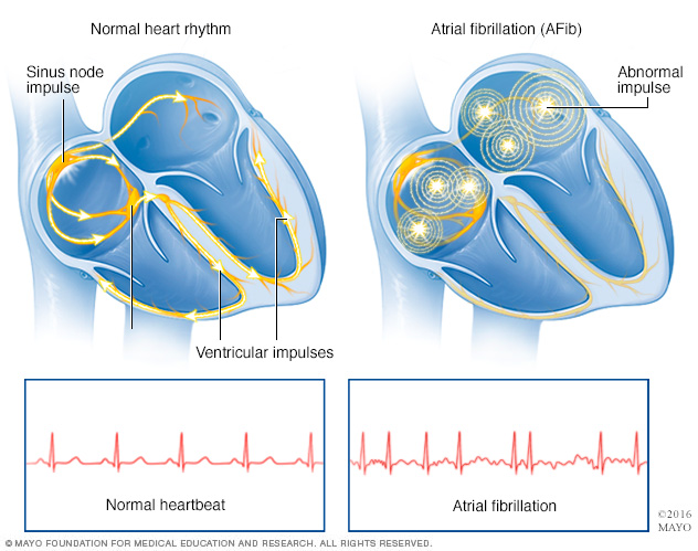 Atrial fibrillation is an irregular and often rapid heart rate that can increase your risk of stroke, heart failure and other heart-related complications.